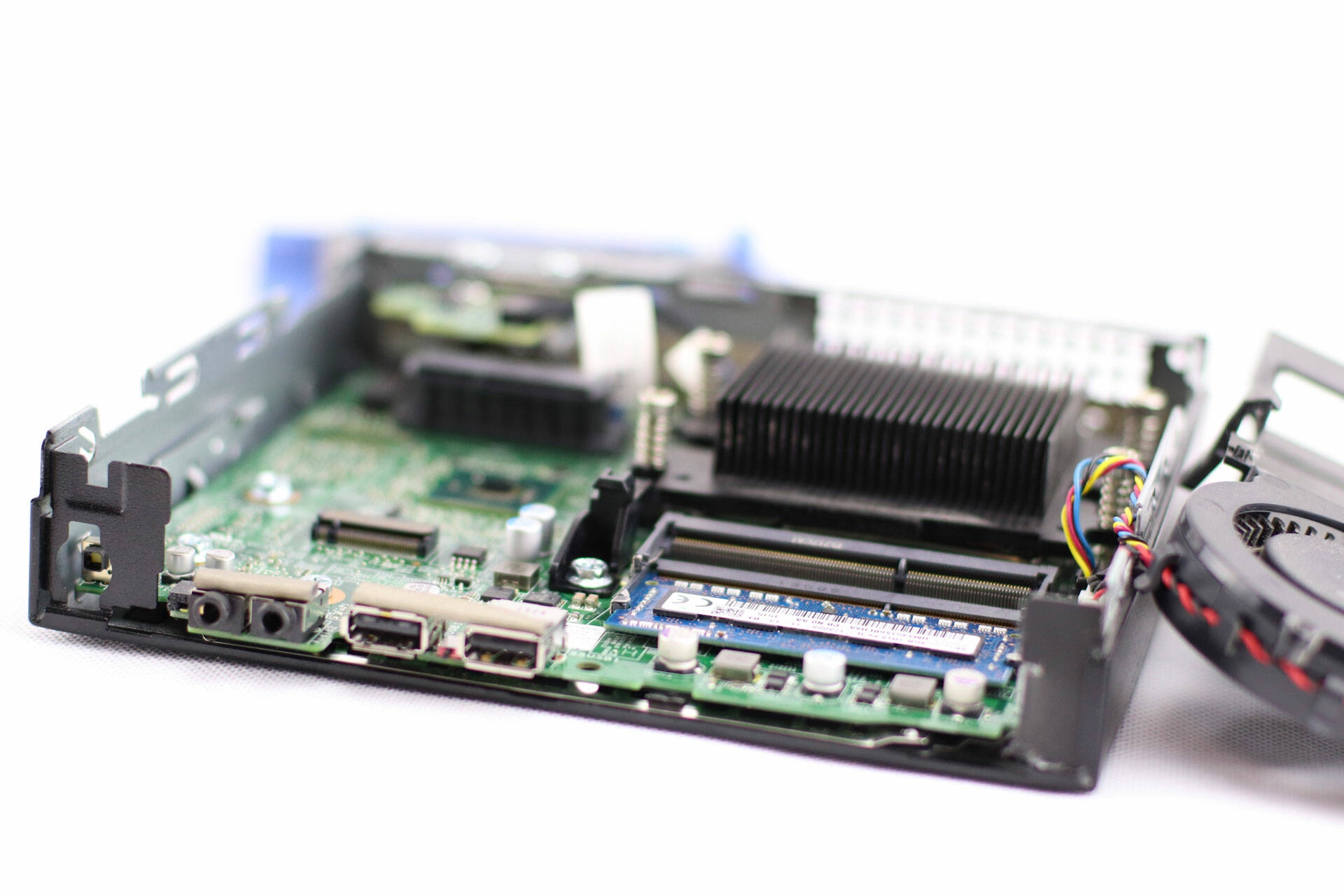L’accès aux entrailles du 3020 Micro se fait par un simple tiroir retenu par une vis, la partie haute coulisse. Une fois retirée, le SSD ainsi que le système de refroidissement se dévoilent. L’accès est étonnamment bon et tout se fait sans aucun outil, vous pouvez donc changer le disque dur, ajouter une carte au format M.2, changer votre mémoire ou tout simplement nettoyer votre ordinateur (très important de dépoussiérer des machines aussi petites où la ventilation est primordiale).